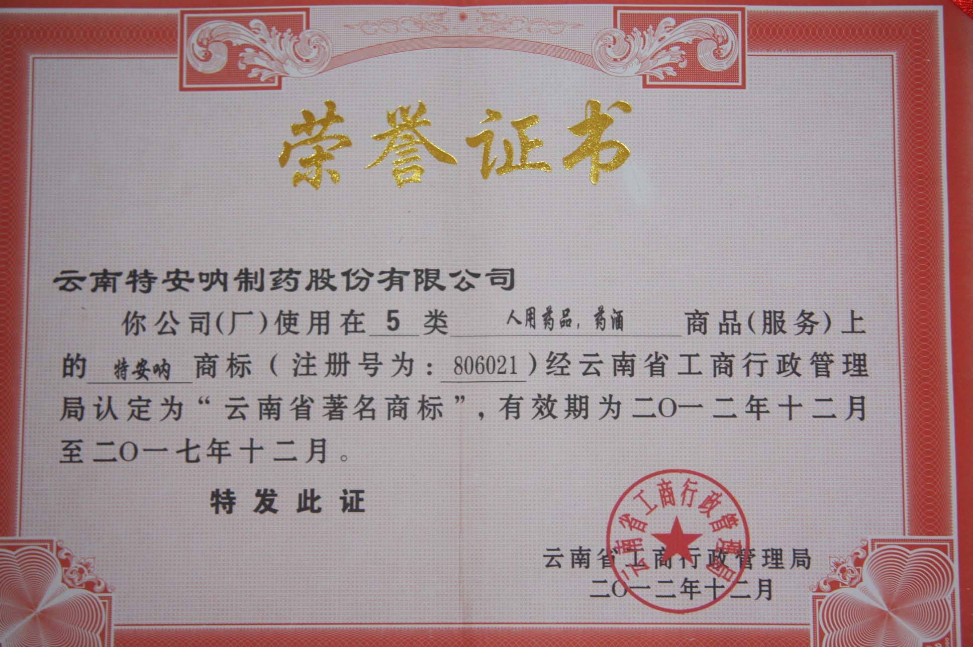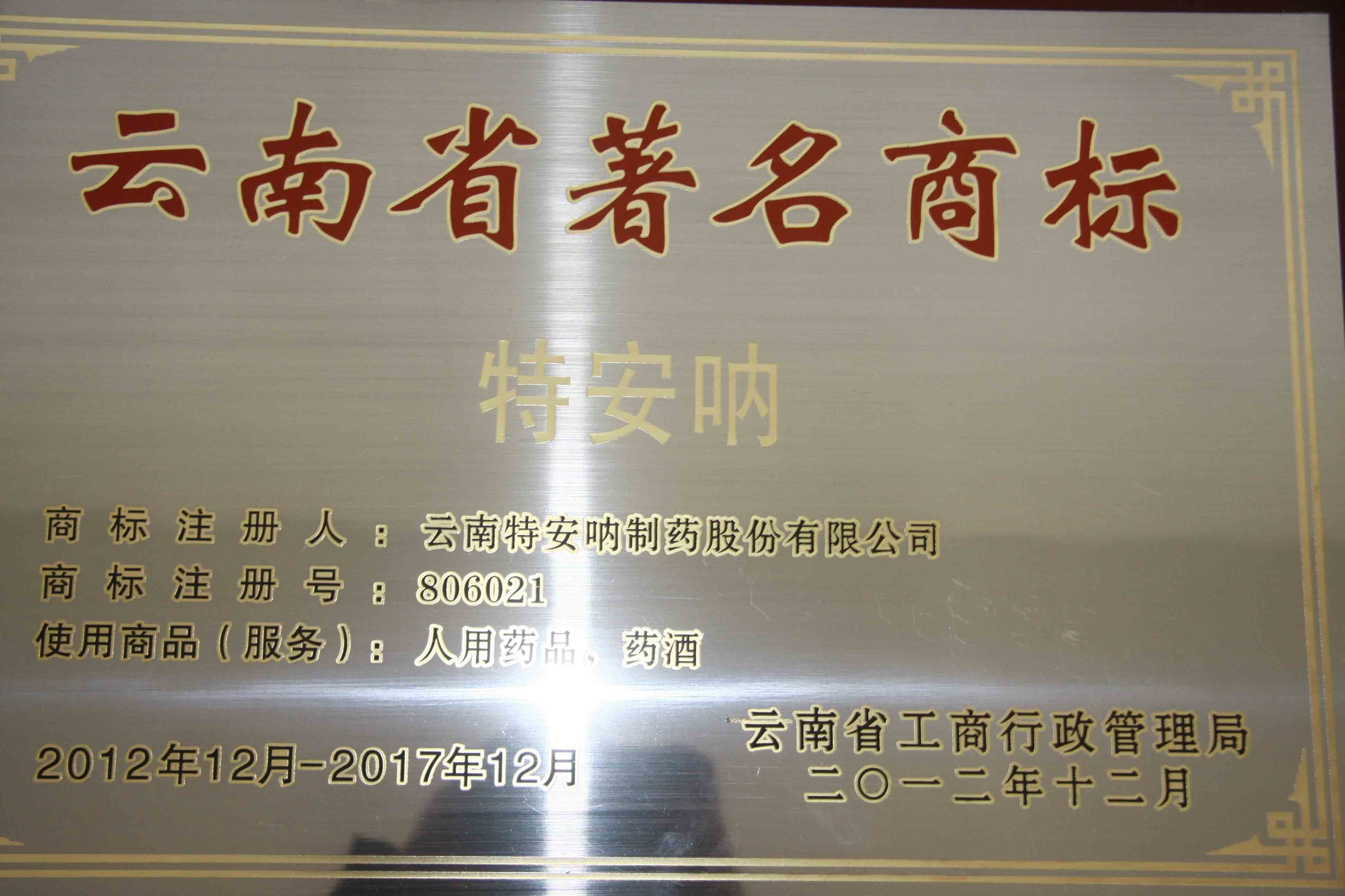 2013年3月28日,公司“特安呐”商标被云南省工商行政管理局认定为“云南省著名商标”。2007年公司英文图案商标就被认定为“云南省著名商标”,此次中文商标的认定,公司将拥有两个省级著名商标,这是对公司知名度、美誉度及社会影响力不断扩大的肯定。多年来,公司投入巨额广告费用,先后在中央电视台、云南电视台、文山电视台宣传文山三七,宣传特安呐产品,使特安呐品牌逐渐深入人心,特别在华东地区,公司生产的血塞通片更成为心脑血管疾病患者的首选,树立了特安呐品牌药好、疗效好的良好社会形象。特安呐人孜孜不倦地追求产品质量,坚信好的产品是生产出来的,不是检验出来的,每一个操作工序的生产者都是质量管理员,对质量的追求造就了过硬的产品品质,最终,赢得了消费者的青睐和主管部门的认可。