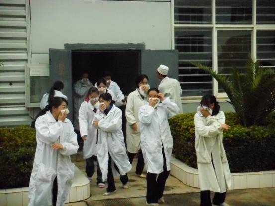 10点钟,提取车间消防警报响起,西门消防控制室显示出是提取车间发生火灾,便立即通知应急指挥部,应急指挥部接到火警报告后,迅速作出决定:立即疏散员工并成立各应急小组,总监控室接到指挥部的疏散通知后,开启车间广播系统播放疏散通告,5分钟后,车间员工从四个消防安全门有序疏散到中心广场,整个应急疏散用时15分钟。