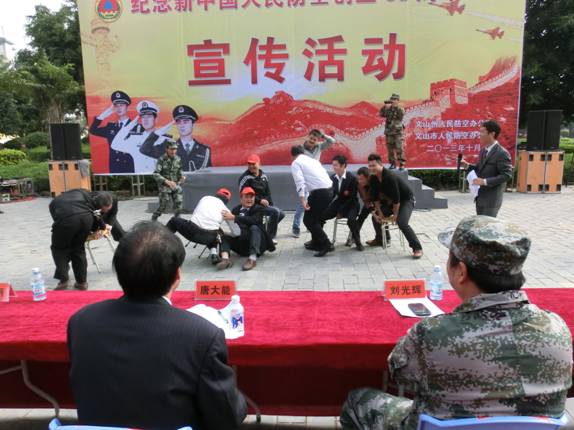 2013年10月27日,为纪念人民防空创立63周年,文山州人民防空办公室、文山市人民防空办公室在文山休闲广场举行纪念人民防空创立人防知识竞赛活动,参赛队伍来自文山州、市10家房地产公司,每家参赛队10人,1名领队,特安呐房地产公司也组队参赛。比赛共分三个环节即必答题、抢答题、风险题。比赛一开始,比分就处于胶着状态,各队分值不相上下,进入抢答题,各队推选一人上台,共10人,互相抢5张凳子,淘汰5人,剩下的5人再抢1张凳子,抢到凳子的即可答题。大家为抢到凳子,都使出了吃奶的力气,有跌倒在地的、有两人同时坐在一张凳子上的、有直接骑在凳子的,场上场下笑声一片,华宇房地产公司的人抢到了3次机会,均答对,分值随之拉开。进入最后一个环节:风险题,每队派出1人上台抽题,题型有20分和40分,答对加分答错扣分,我公司决定放手一博,选40分题,可惜答错了,被扣去40分。最终公司参赛队获得本次竞赛优秀奖。通过竞赛,大家增长了知识,锻炼了自己,收获了友谊,同时也宣传了公司,真是一举多得。