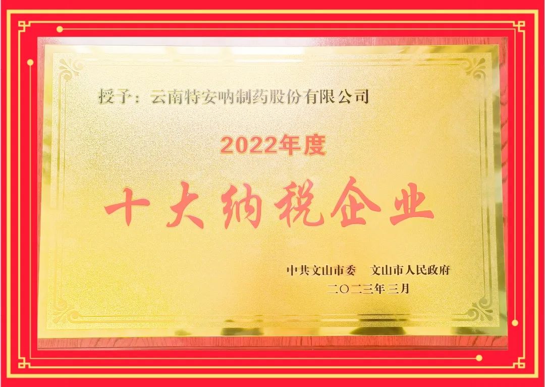 2023年3月15日,文山市隆重举行2022年“十大纳税企业 十大民营企业”表彰晚会,云南特安呐制药股份有限公司(以下简称公司)荣获文山市委、文山市人民政府授予的2022年度“十大纳税企业”称号。此项荣誉是对公司诚信经营、依法纳税、支持当地经济社会发展和积极承担社会责任的高度肯定。