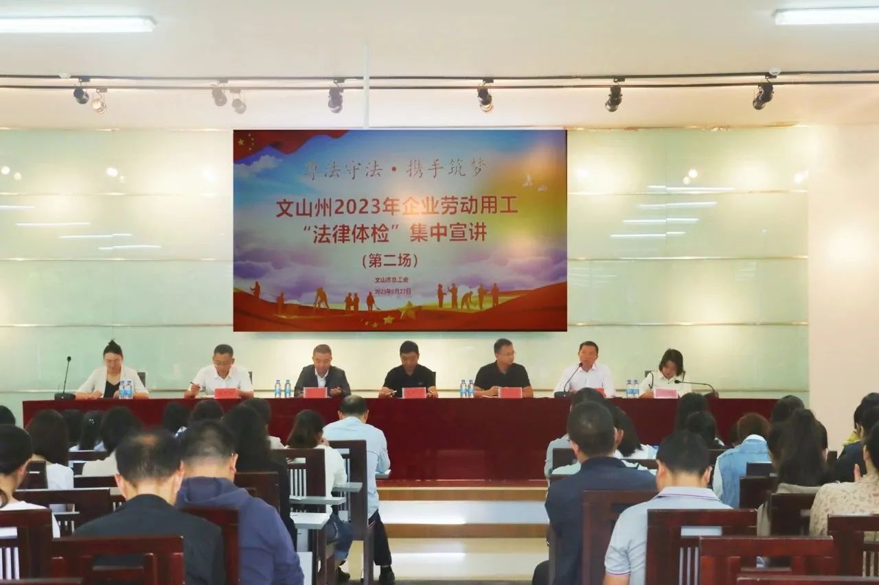为落实好企业劳动用工合规合法要求,切实保障劳动者与用人单位(企业)的合法权益,文山州、市总工会于9月27日在特安呐公司召开文山州2023年企业劳动用工“法律体检”集中宣讲。文山市辖区150家知名企业和新就业形态企业代表及公司工会和相关部门负责人参加宣讲会。