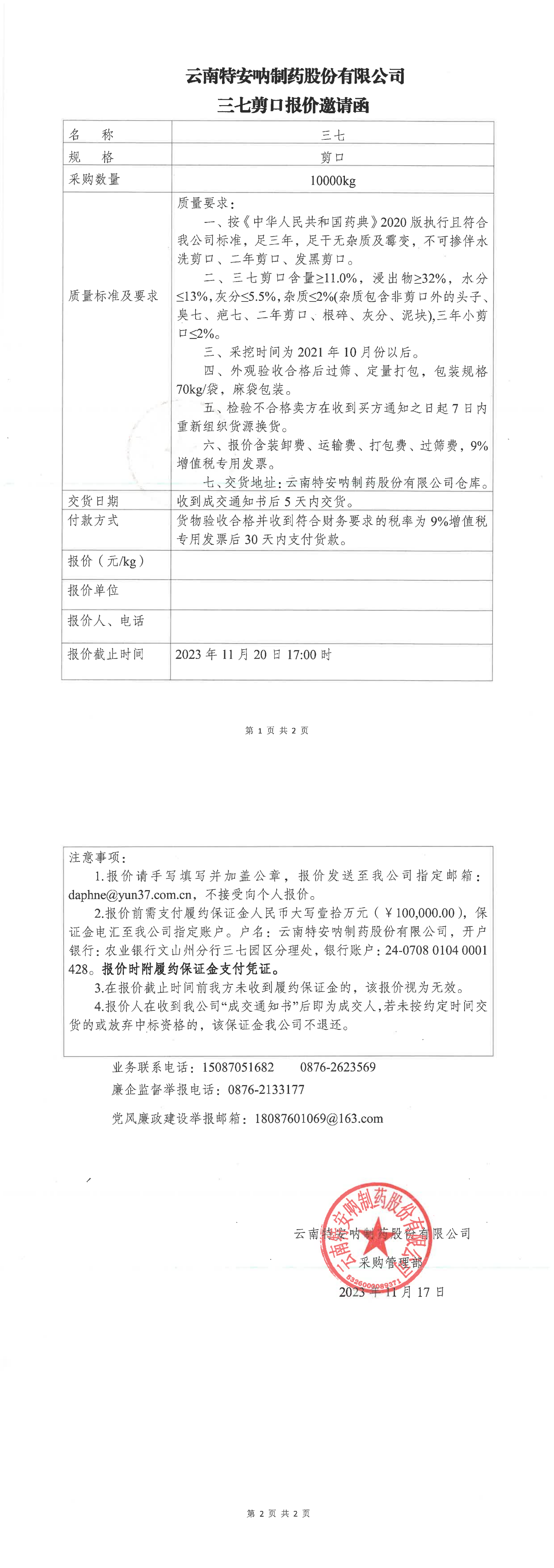 云南特安呐制药股份有限公司 三七剪口报价邀请函
