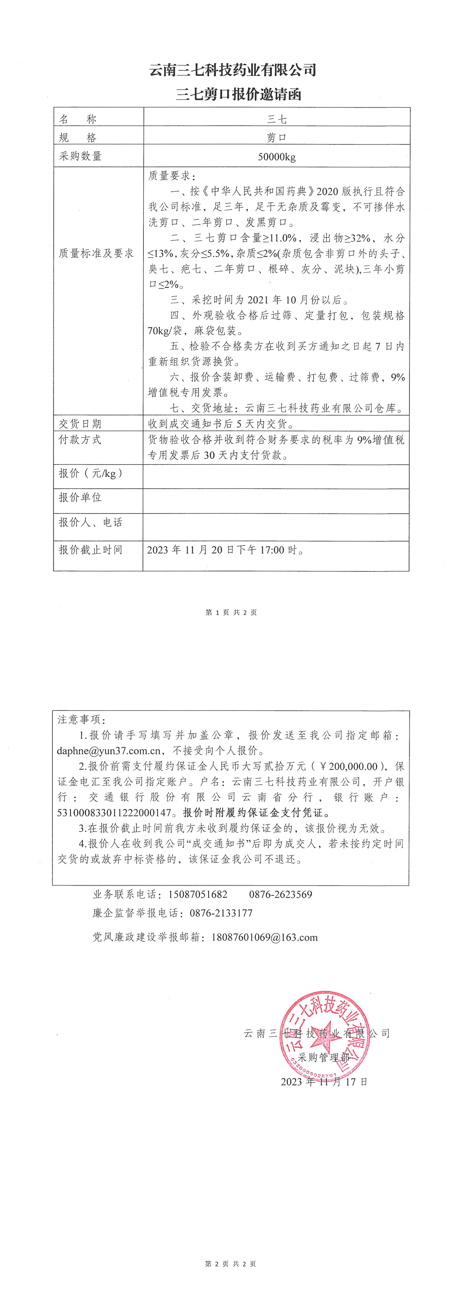 云南三七科技药业有限公司 三七剪口报价邀请函