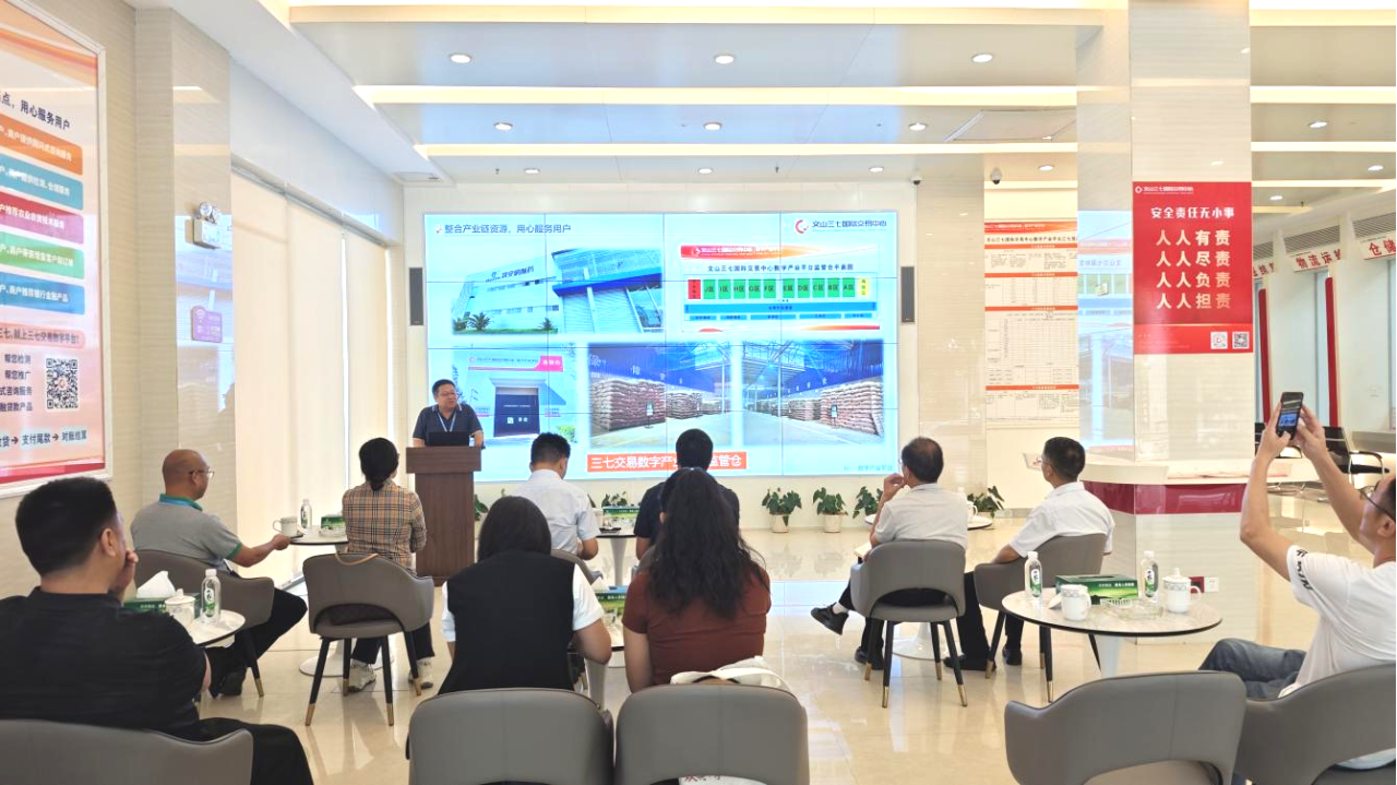 熊仕禄一行先行前往三七交易数字平台进行调研,听取了数字平台负责人陈建华对线上交易平台建设、管理规范的介绍,深入了解了文山州三七交易模式向数字化信息化转型的建设情况。
